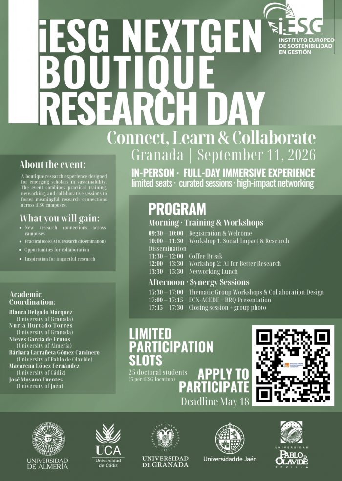 I Encuentro Boutique de Jóvenes Investigadores iESG El NextGen Boutique Research Day – iESG se celebrará el 11 de septiembre de 2026 en Granada, dirigido a doctorandos en sostenibilidad interesados en formación, networking y colaboración científica. El evento ofrecerá una experiencia inmersiva con talleres, sesiones prácticas y espacios para generar conexiones académicas de alto impacto. La convocatoria ya está abierta, con 25 plazas disponibles. El programa contará además con la participación de ECN-ACEDE, reforzando la conexión entre jóvenes investigadores y la comunidad académica. Envío de contribuciones hasta el 18 de mayo. |