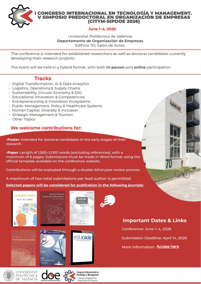 El Departamento de Organización de Empresas (DOE) de la Universitat Politècnica de València organiza el I Congreso Internacional en Tecnología y Management (CITYM), que acogerá el V Simposio Predoctoral en Organización de Empresas (SIPDOE). Tendrán lugar del 1 al 4 de junio de 2026, online y presencial, dirigido tanto a investigadores consolidados como a doctorandos.