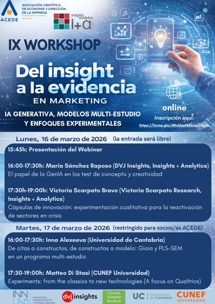 IX Workshop de la sección de Marketing: “Del insight a la evidencia” Los días 16 y 17 de marzo de 2026 se celebró en formato online el IX Workshop “Del insight a la evidencia en marketing”, organizado por ACEDE Marketing e Insights + Analytics España. El encuentro reunió a especialistas y académicos para debatir sobre inteligencia artificial generativa, modelos multi-estudio y enfoques experimentales aplicados al marketing. El programa incluyó distintas ponencias centradas en creatividad, test de concepto, experimentación cualitativa y nuevas tecnologías aplicadas a la investigación. Con ello, el workshop volvió a consolidarse como un espacio de referencia para debatir sobre cómo transformar el insight en evidencia útil para la toma de decisiones en marketing. En este enlace se puede consultar el programa del evento. |