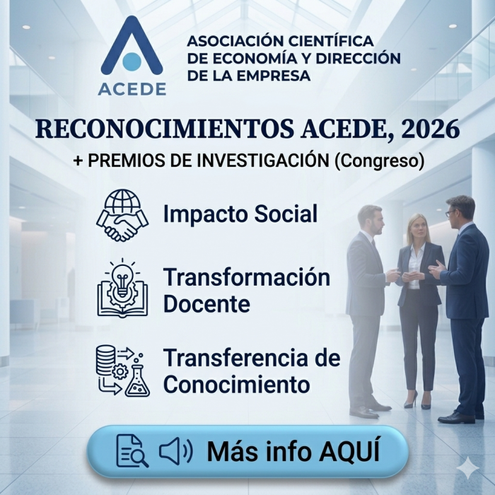 Convocatoria de candidaturas a 4 Vocalías de la Junta Directiva Se abre el plazo de presentación de candidaturas, del 6 al 26 de abril, para la renovación de 4 Vocalías de la Junta Directiva de ACEDE (período 2026-2030, con reevaluación en 2028). En esta convocatoria podrán presentarse candidaturas para la Vocalía 2 (Congreso y taller doctoral); Vocalía 7 (Canales de comunicación externos), Vocalía 8 (Relaciones institucionales y patrocinios) y Vocalía 9 (Comunidad y expansión). Animamos a las personas asociadas que cumplan los requisitos estatutarios a valorar su presentación. Más información y acceso al formulario de candidatura: |